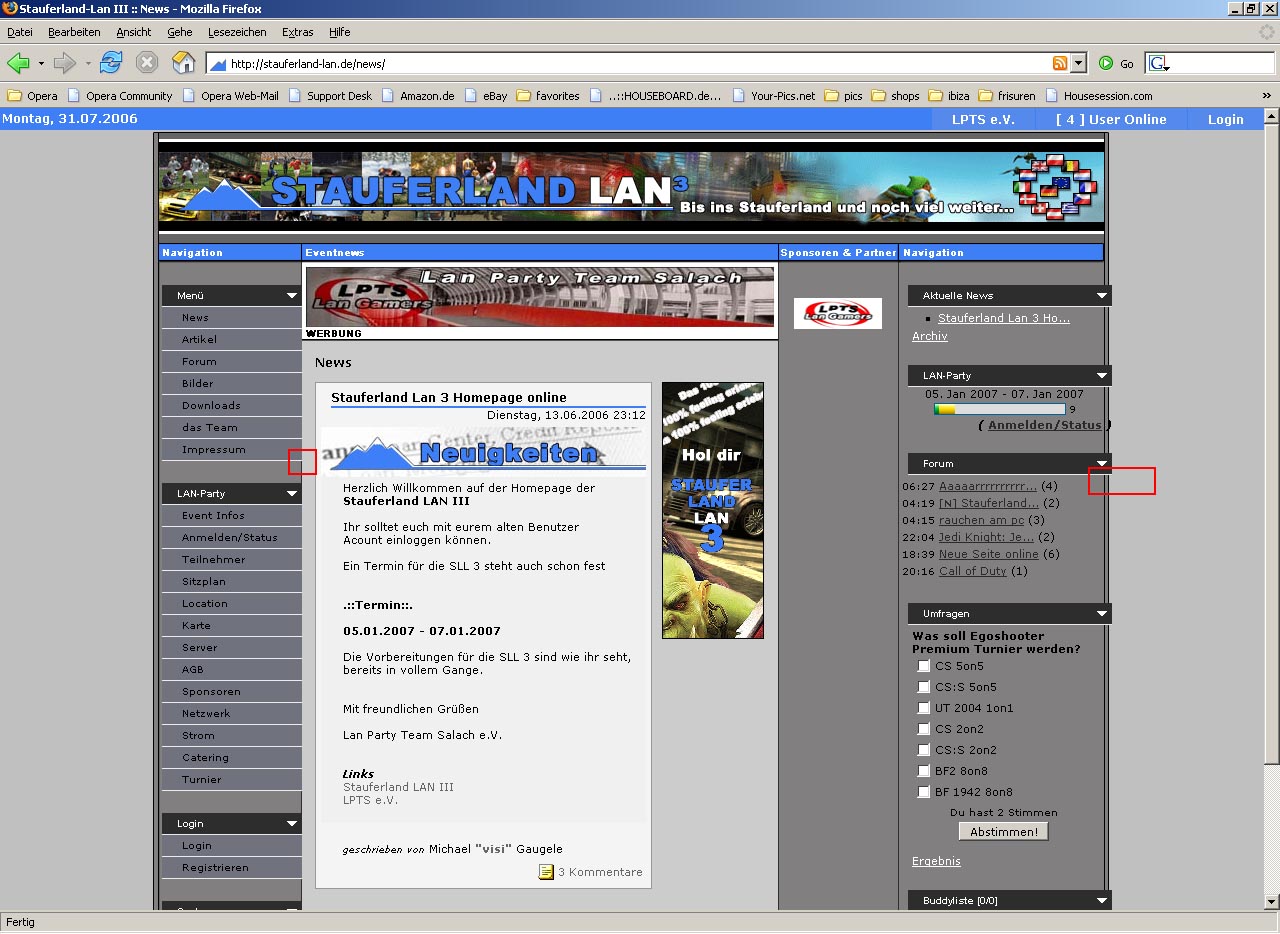hi, schaus dir mal nun an www.stauferland-lan.de ! Geht soweit, nur das rechts nun der hintergrund zu weit nach rechts geht - kannst mir da vielleicht auch noch weiterhelfen? [Editiert von Chrissi am 06.Aug.2006 um 09:47] |