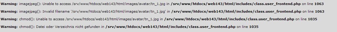 Hi, bei uns tritt auch der Fehler auf, beim uploaden, zumindest bei 2 accounts, ob mehr betroffen sind kann ich nicht sagen: Der Fehler tritt auf wenn man ein Avatar uploaden + text hinzufügt, oder nur uploadet. Beim wechseln des Textes entsteht keiner. Chmod ist auf ganzen ordner + subordner auf 777 Ich nutze die php4 version btw. Wird das Bild upgeloadet wird normgerecht das bild ACCOUNTID.jpg angelegt, jedoch die verkleinerte Version tn_ACCOUNTID.jpg fehlt vollständig. [Editiert von cike am 30.Jan.2007 um 22:36]